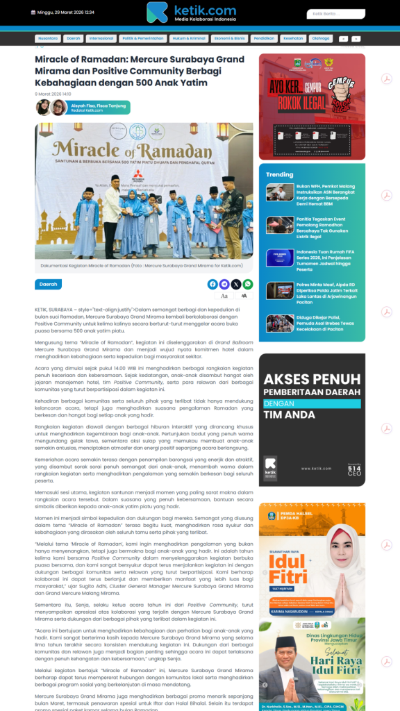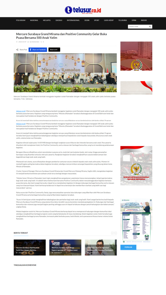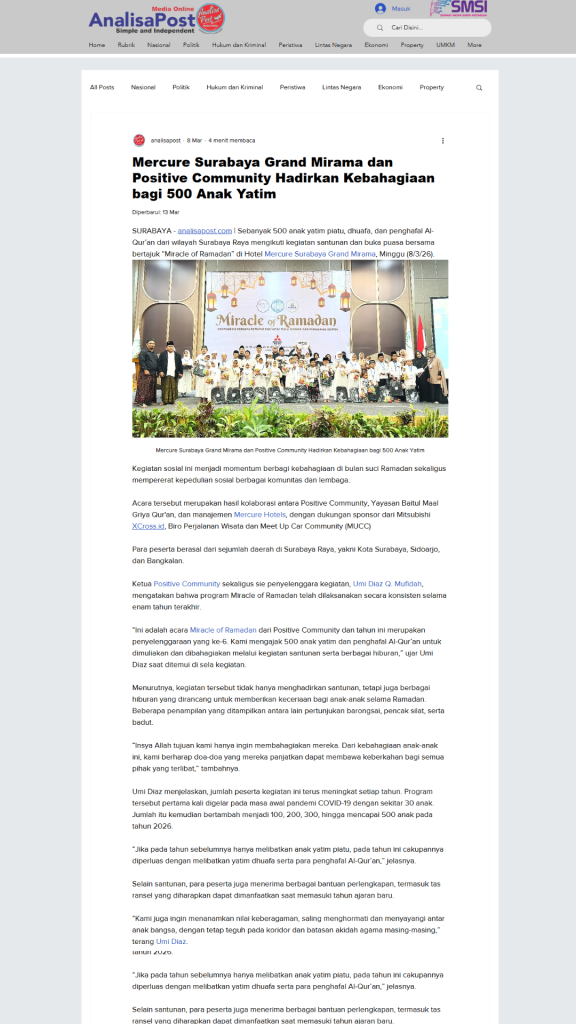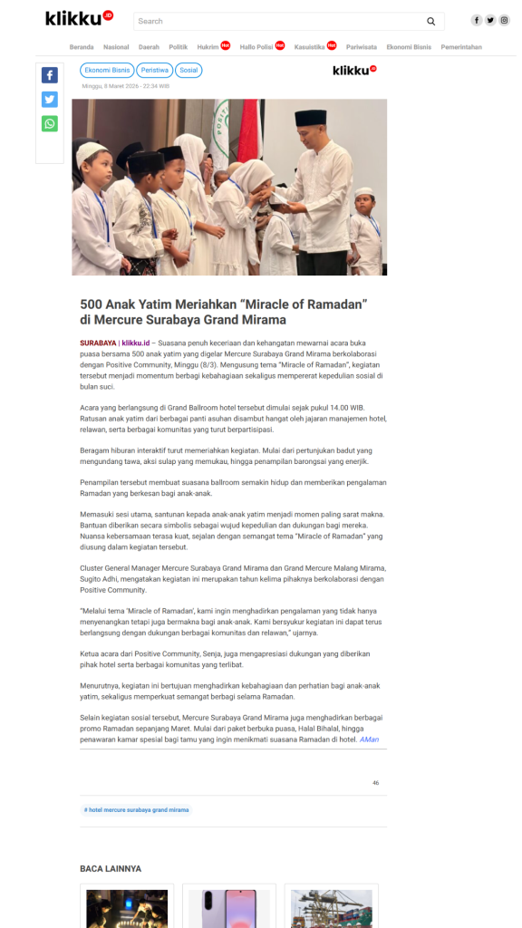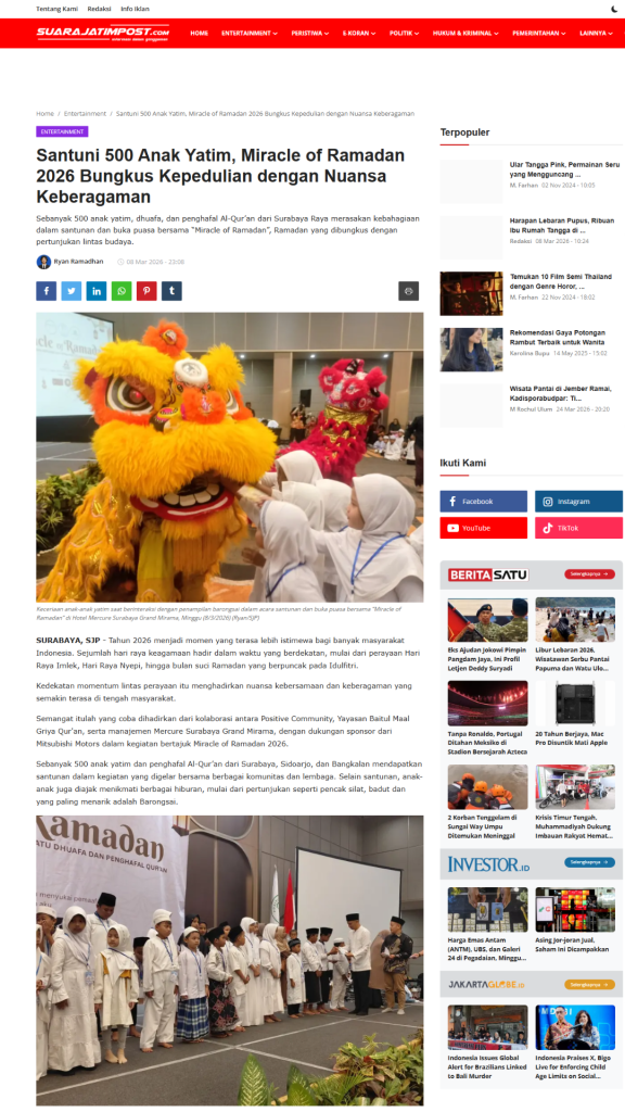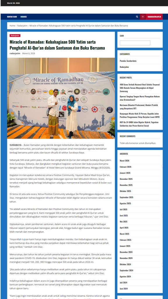 Terimkasih untuk segenap Relawan, Orang Baik, CSR Coorpotare, Lembaga Kemanusiaan dan Komunitas-komunitas yang tergabung turut membersamai membahagiakan adik-adik, serta beberapa Media yang turut mensupport baik sebelum acara maupun setelah acara dengan menampilkan Press Release Miracle of Ramadhan 2026.