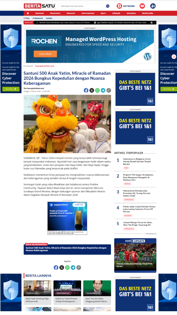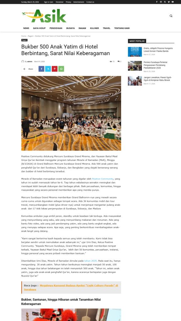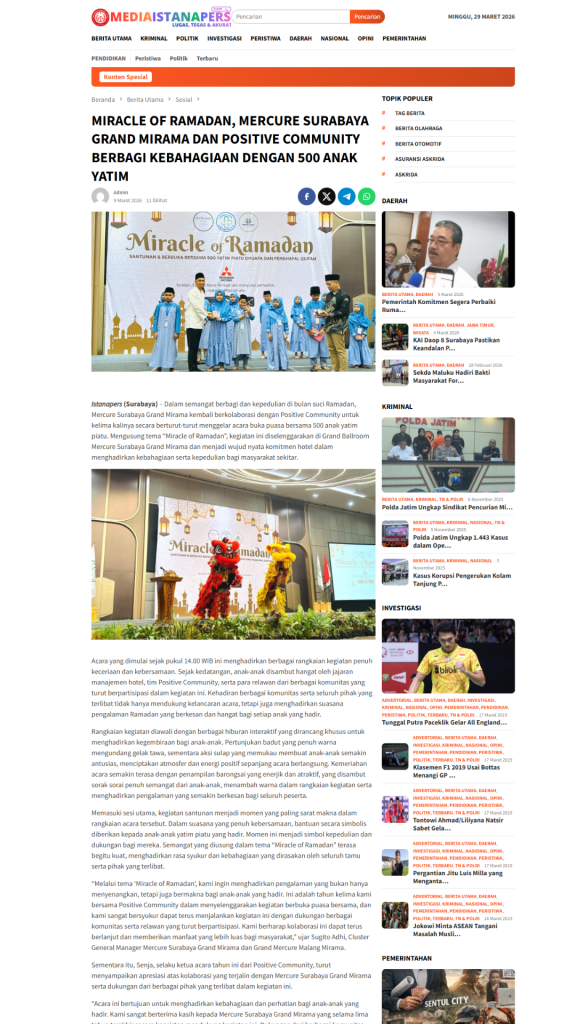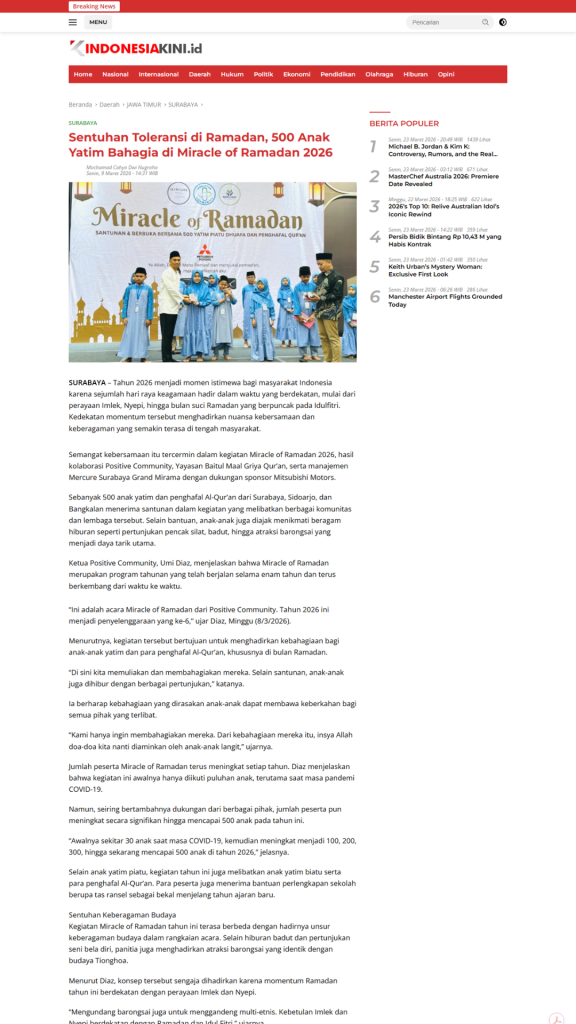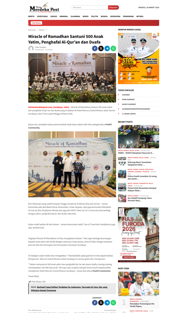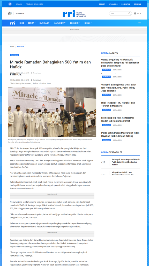 Termonitor oleh tim, moment Miracle of Ramadhan 2026 dipublish 19 Portal Media Online, 8 Instagram dan 1 Youtube, data tersebut selain post Internal dan diluar para tamu/relawan/media LIVE Facebook dan Tiktok